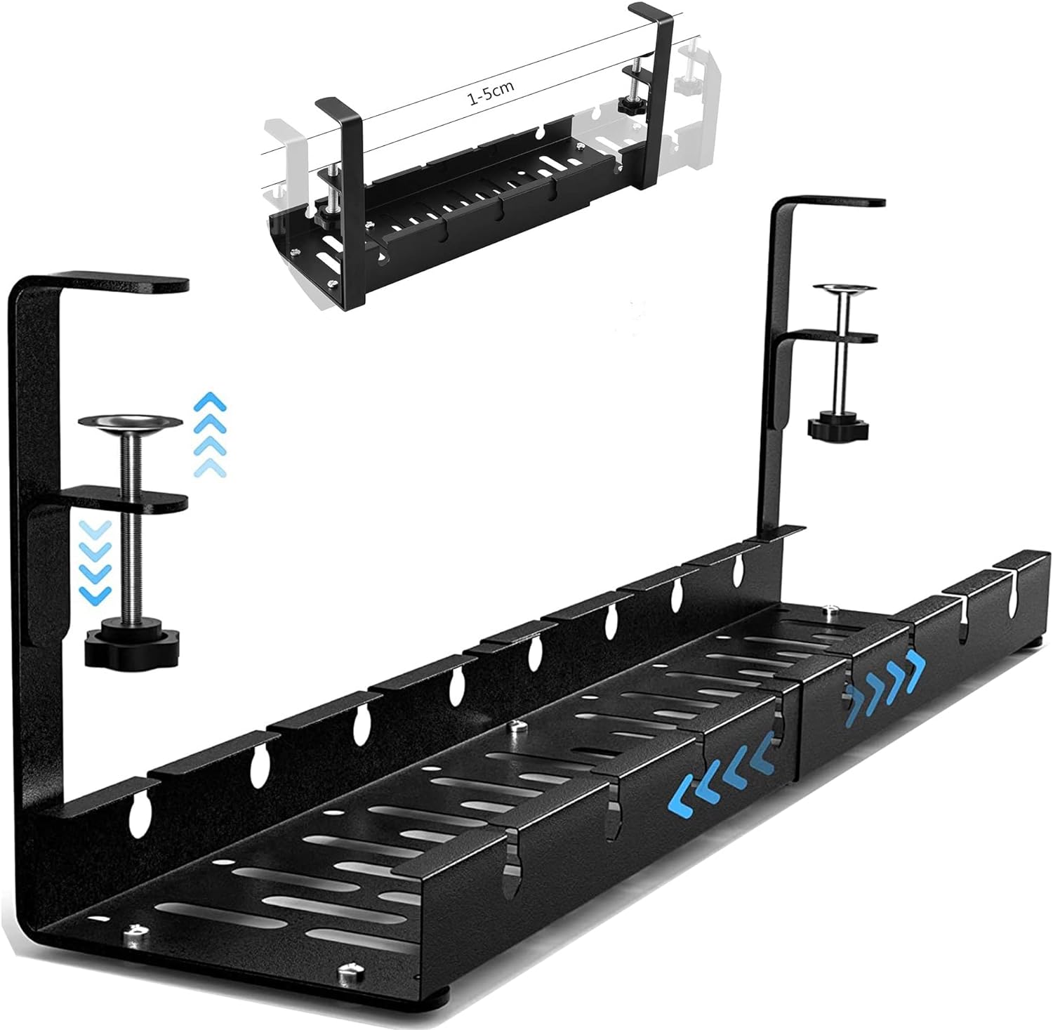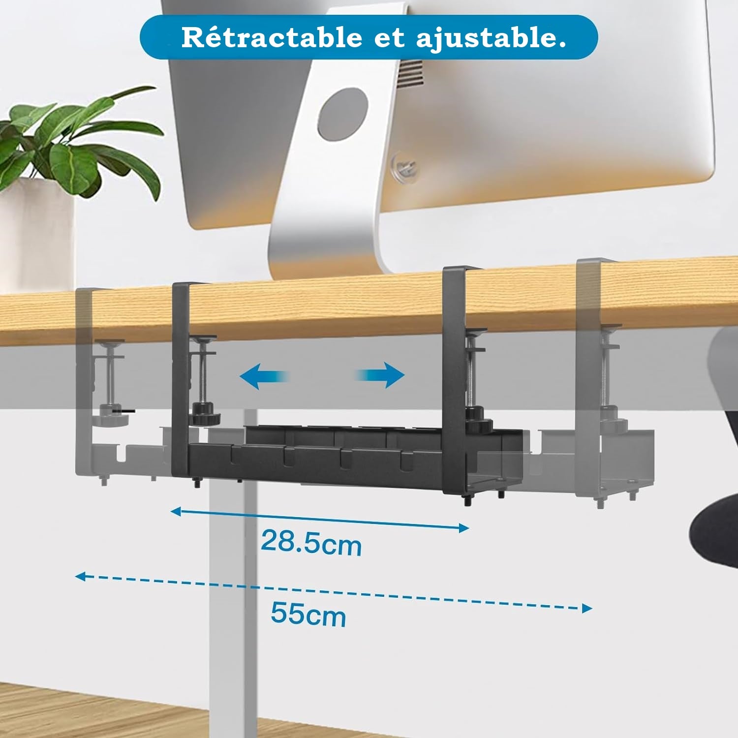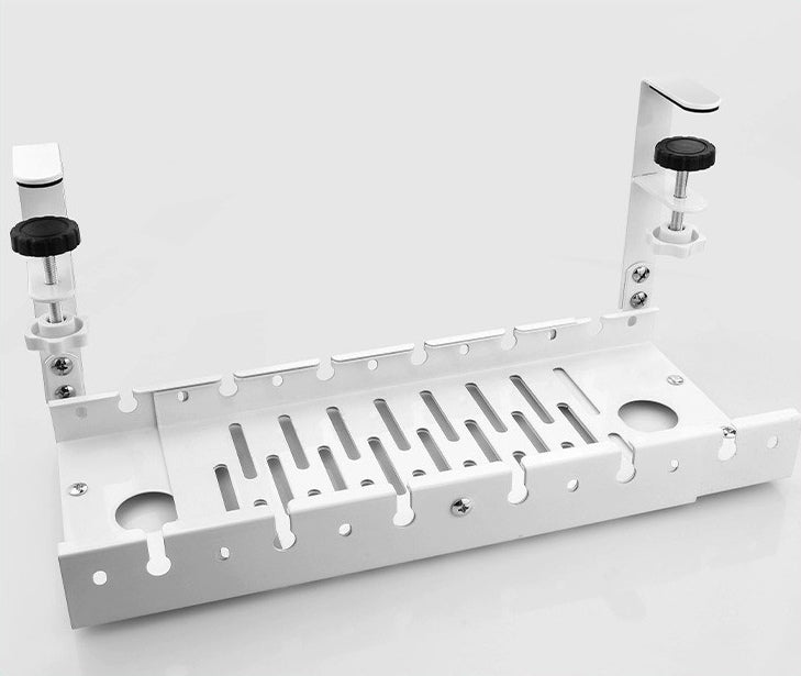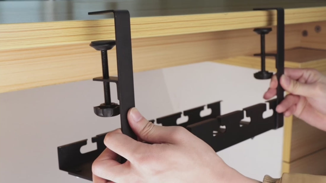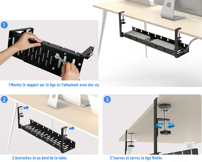 Facile à assembler sur la table sans causer de dommages. Sans perçage ni vissage, il suffit de tourner les deux boutons noirs sur le plateau de câbles avec des pinces pour ajuster le support métallique de câbles fermement à votre bureau.